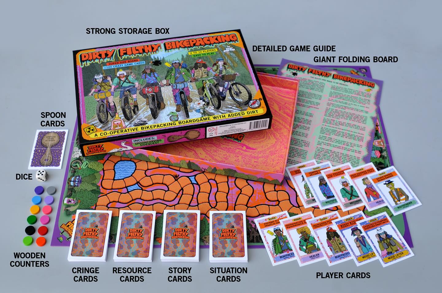 With the help of my own long-suffering group of crazy bikepacker friends and many hours of extremely fun games testing and designing I am happy to launch this little pedal swan into the choppy waters. This is a crazy and chaotic game that captures the fun, filth and freaky times of bikepacking.